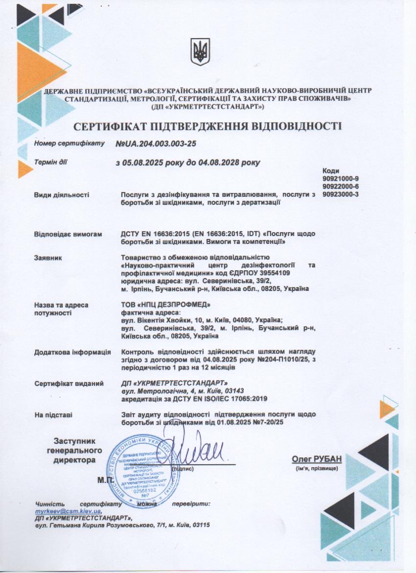 Ми гордимося тим, що система управління стосовно надання послуг з контролю шкідників, визначення їх виду, моніторингу на виявлення та елімінацію шкідників, проведення профілактичних заходів щодо запобігання проникнення шкідників на підконтрольні об’єкти(код ДКПП 81.29), яка запроваджена і здійснюється нашою компанією, підтверджена Сертифікатами виданих акредитованим органом оцінки відповідності за міжнародними стандартами ISO 22000, ISO 9001 та ISO 1400